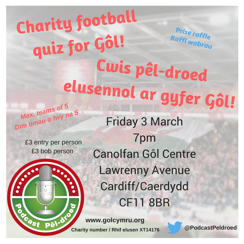 Thanks to Podcast Pel-droed for offering to host a quiz in aid of Gôl on Friday 3rd of March. Just £3 per person in the shadow of our national stadium. Get down to help us raise vital funds for our upcoming visits in Ireland and Serbia and test your football knowledge!