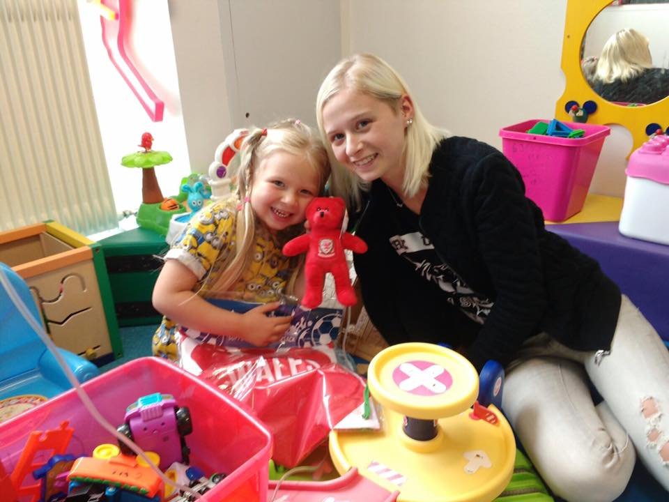 Despite yesterday’s disappointment, Gôl representatives were brought back to earth today with a visit to the Paediatric Ward at Lens Central Hospital. We were shown around the facilities by Pauline Caron, and were able to give gifts from Wales to the children suffering from various illnesses or injuries. Pictured are Lilly, aged 4, who is recovering from appendicitis; Nasim, 11; and Olivia, 12. Nasim quipped that Bale was ‘the best player at the Euros!’